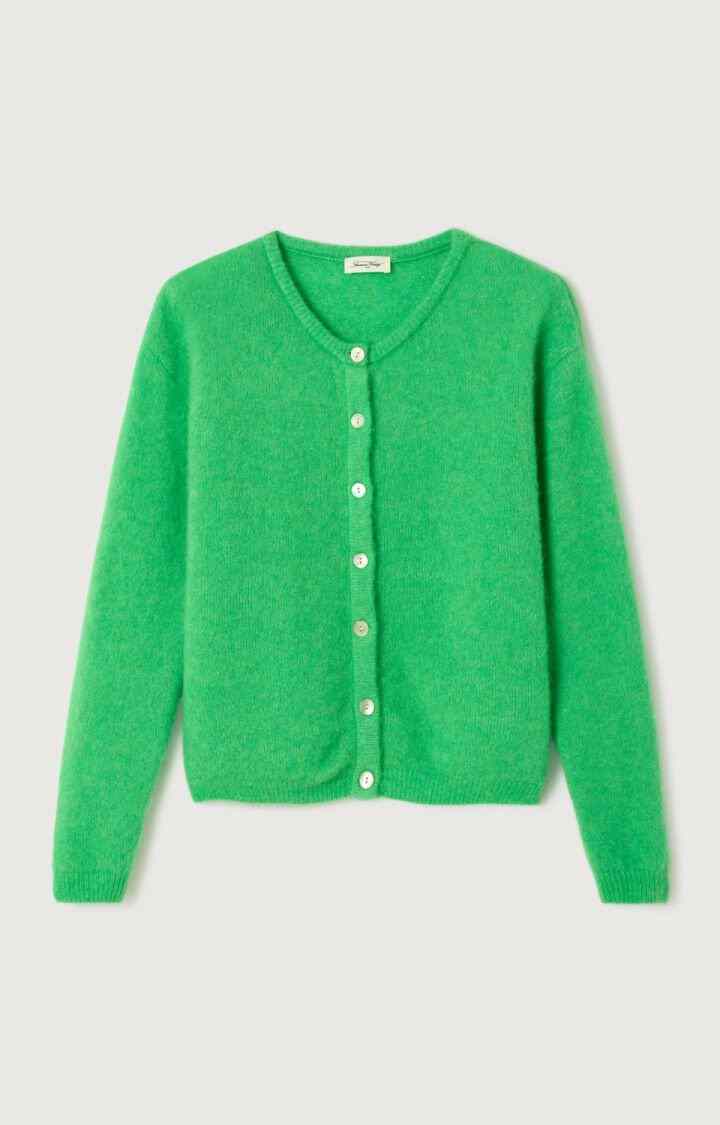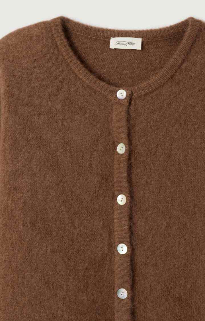 Short long-sleeved cardigan with round neckline and pearlised buttons.