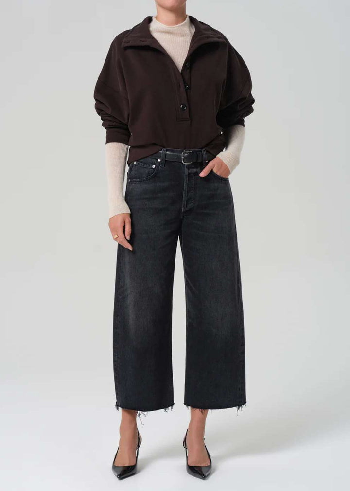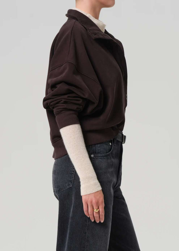 The ‘Mirelle’ is a modern update to the classic sweatshirt, crafted from soft brushed fleece with a plush, cosy feel. Designed with a high funnel neckline and button closure, the relaxed silhouette offers warmth and polish in equal measure. Ideal for off-duty layering or elevated lounging.