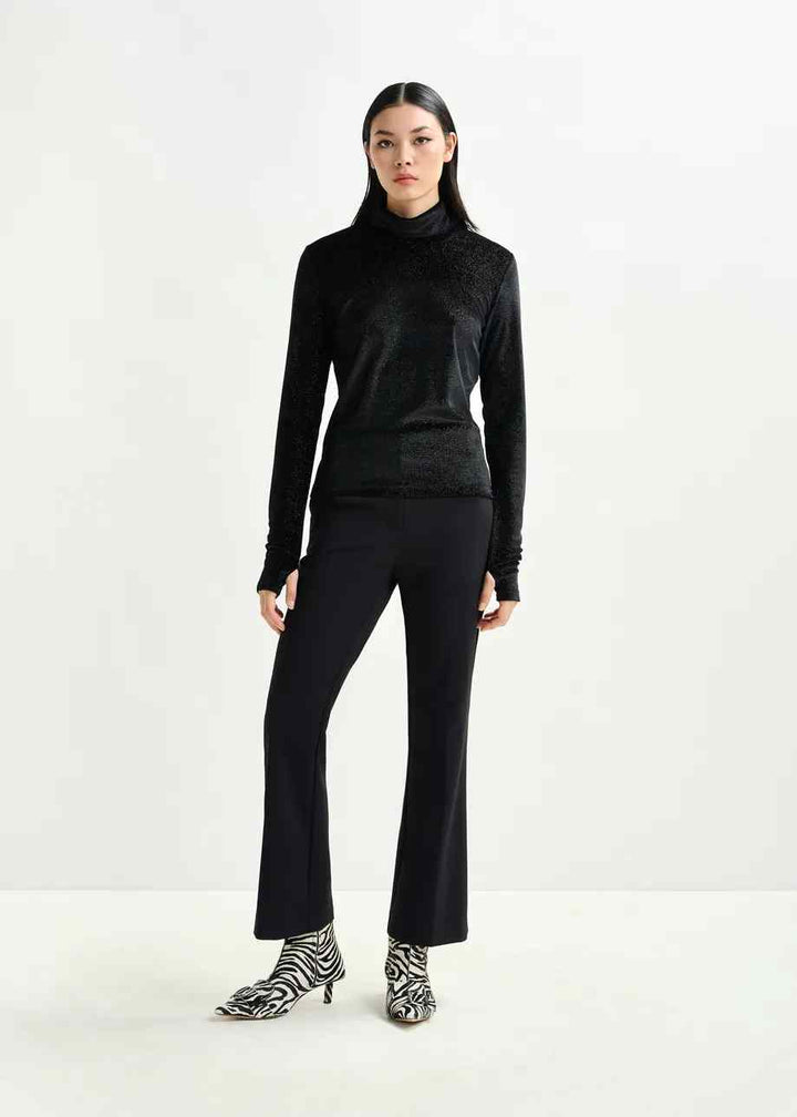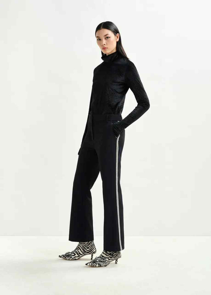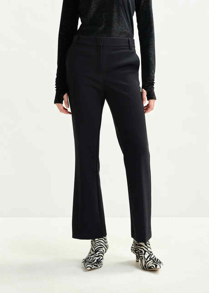 Tailored from a fabric blend containing recycled polyester, these pants are cut to a flared silhouette with pressed creases along the front and back. Slanted side pockets and welt pockets at the back offer classic structure, while rhinestone embellishments trace the side seams for a subtle statement. Designed with belt loops, a clean inside waistband, and a zip and hook fastening for a polished finish.
