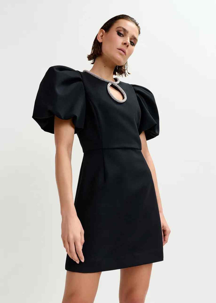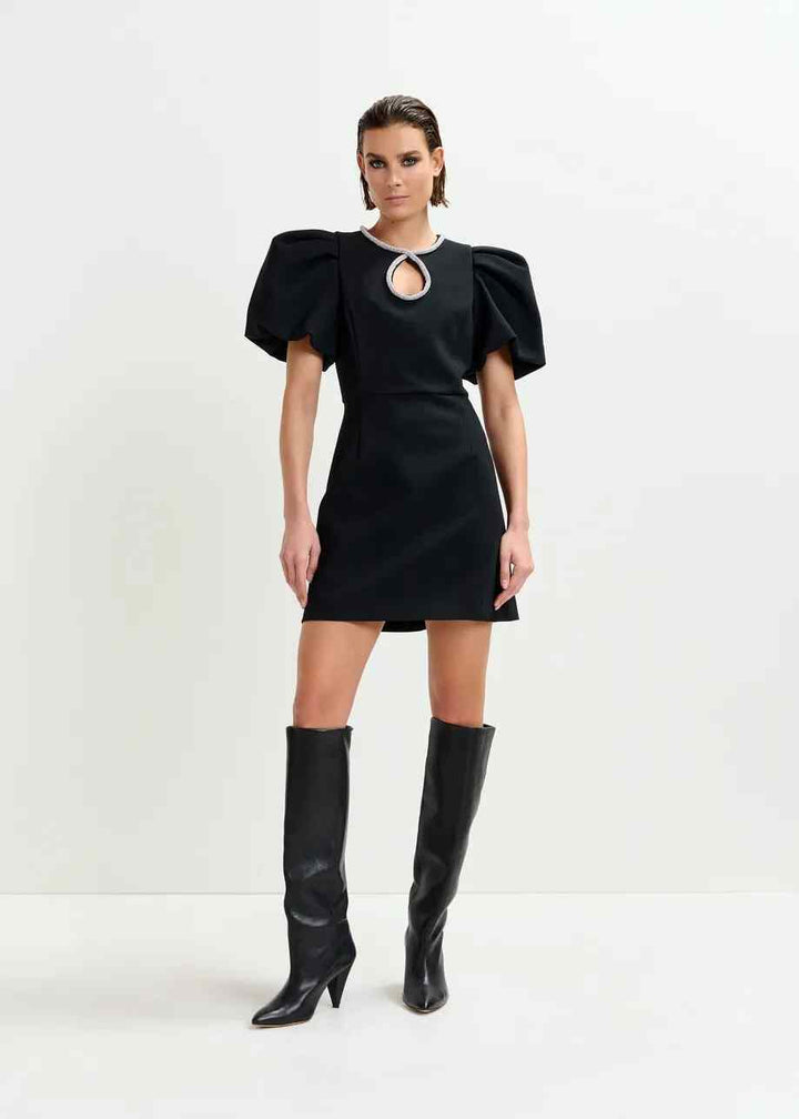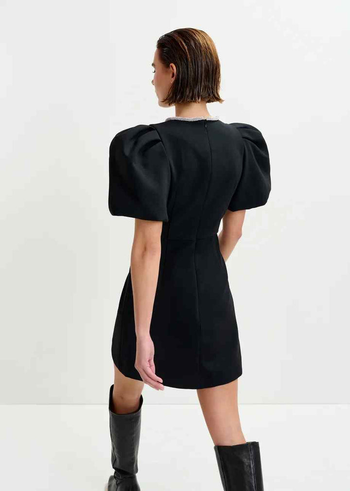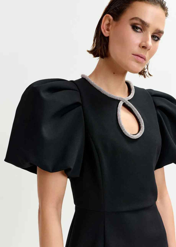 Tailored from a structured fabric blend with recycled polyester, this mini dress makes a bold impression with its voluminous puff sleeves and clean, sculpted lines. The bodice is fitted, giving way to a subtly flared A-line skirt that enhances the silhouette. A teardrop-shaped keyhole neckline is framed with rhinestone embellishment. Fully lined for comfort, it fastens with a concealed zip at the back for a smooth finish.