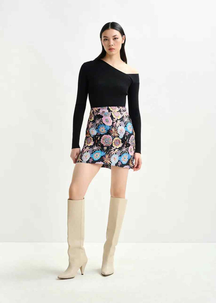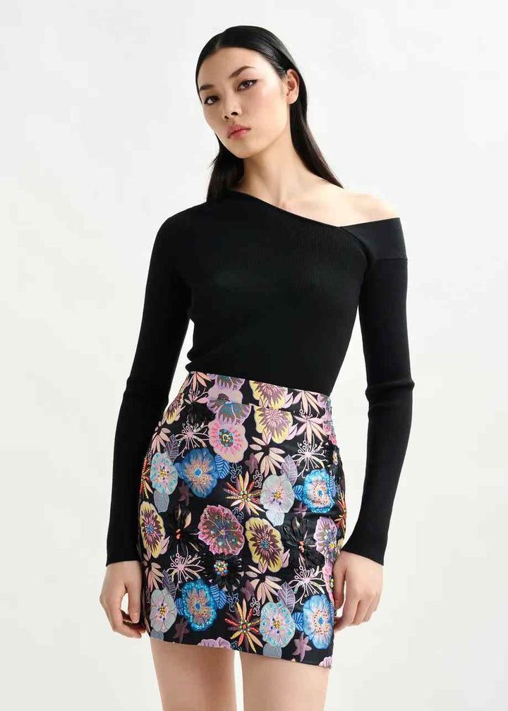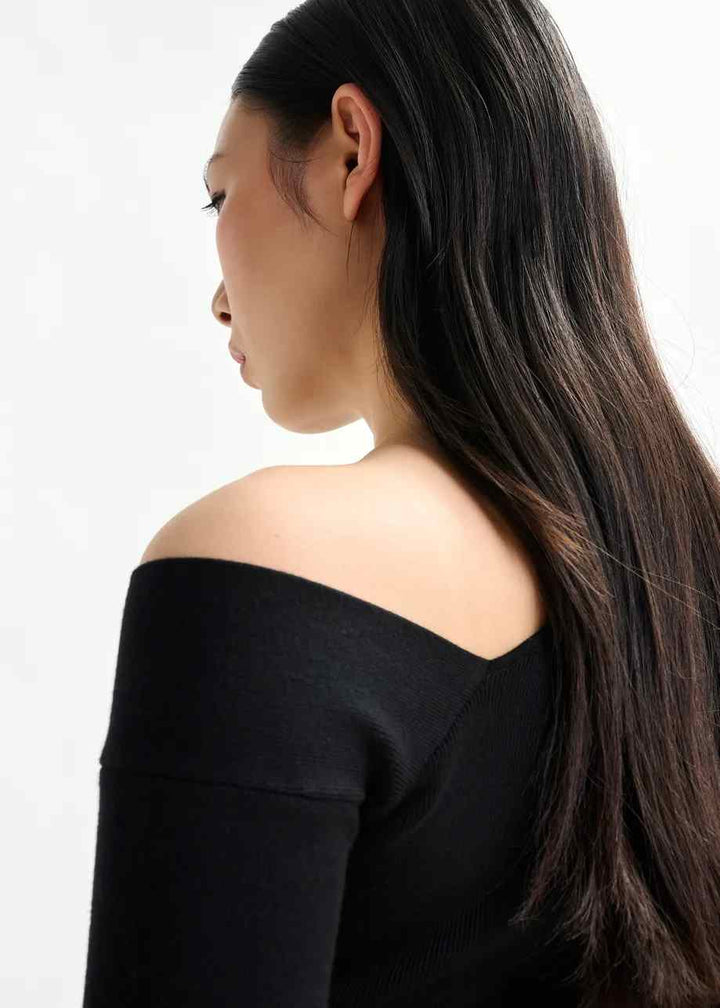 Sweater is finely ribbed for a close, flattering fit that's ideal for tucking into high-waisted bottoms. The elegant piece drapes off the left shoulder thanks to the asymmetrically cut neckline.
