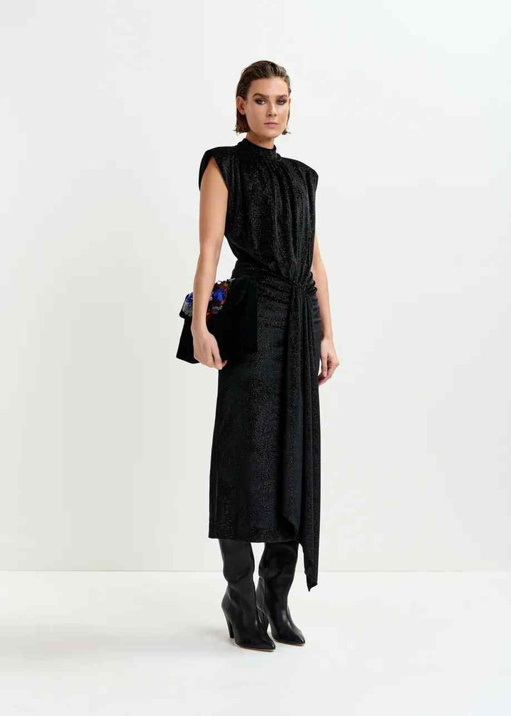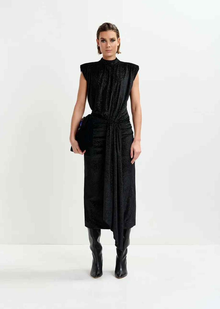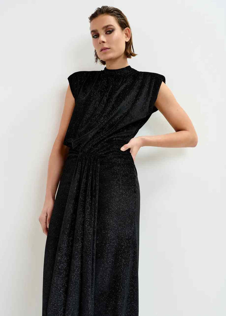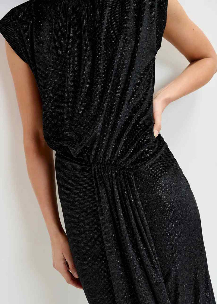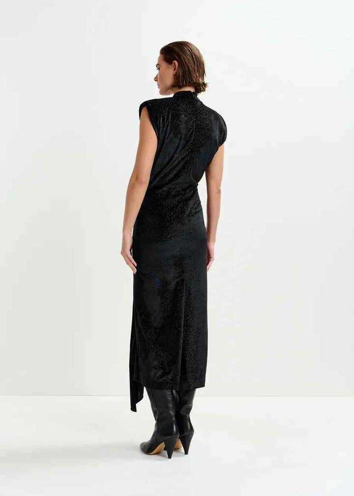 Midi dress, cut from a comfortable stretch-jersey fabric embellished with black-tone dots for a glitter-like finish. It features a figure-hugging silhouette at the waist and falls into a wrap-inspired skirt with box pleat gathering at the front and generous split. Lightly padded shoulders and a flattering mock neck complete the design.