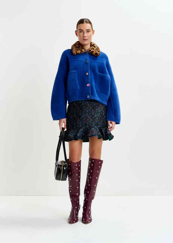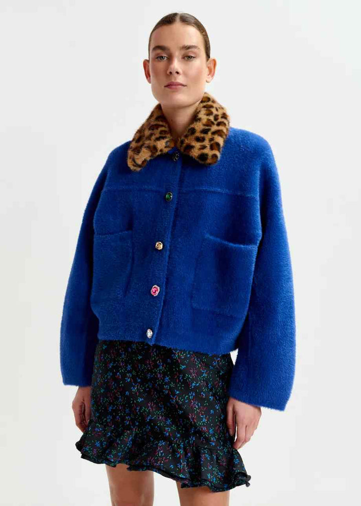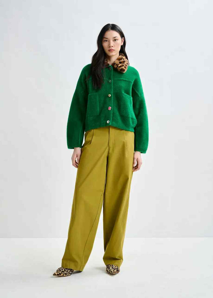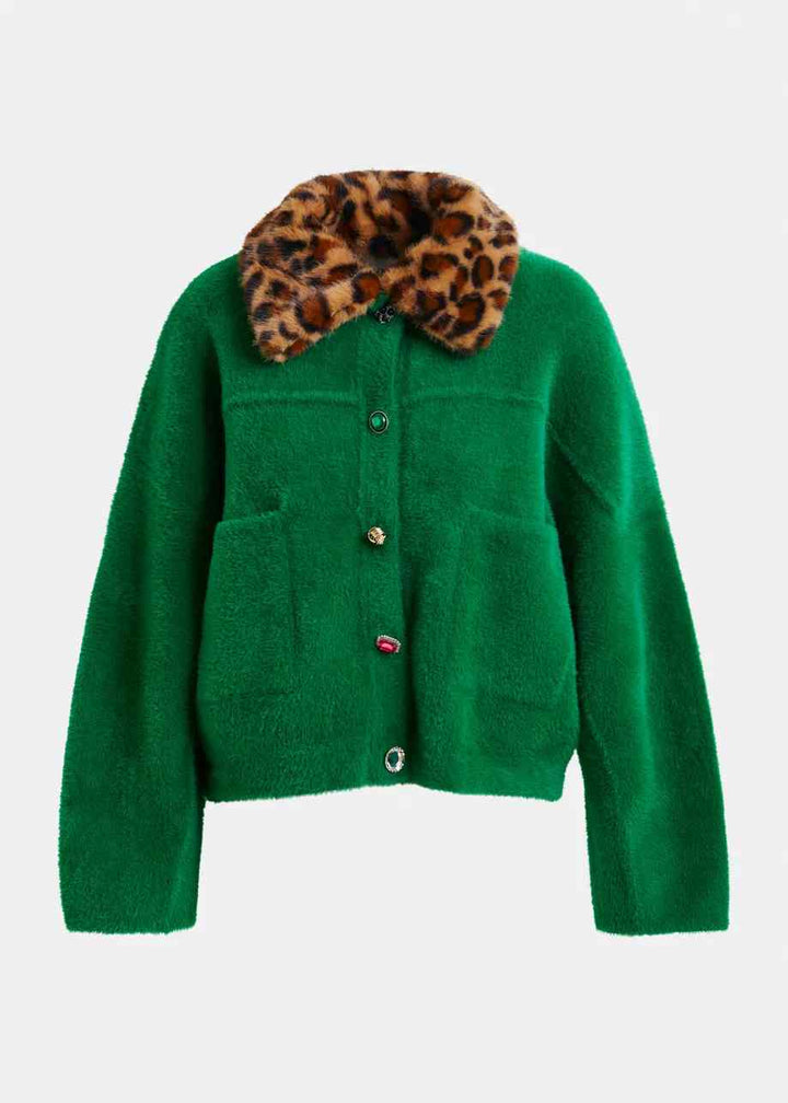 Eye-catching cardigan is designed for a relaxed fit. Featuring a mix of playful, mismatched buttons along with two functional patch pockets. This piece blends quirky charm with everyday comfort. The standout feature? A removable leopard-print faux fur collar that lets you switch up your style on a whim. Perfect for layering or making a statement all on its own.