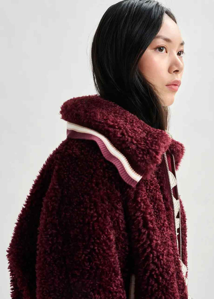 Bomber-style jacket is crafted with a high-pile faux shearling texture. Designed for an oversized fit, it features a full zip fastening and is fully lined for easy layering. Ribbed knit trims at the hem, cuffs, and collar add a sporty edge, while contrasting stripe details provide a graphic finish. Functional side pockets complete the look, making this jacket both stylish and practical for cooler days.