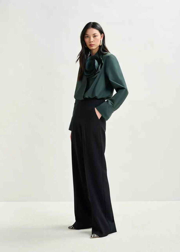 These trousers feature a low-rise waist and a wide-leg cut. The elasticated waistband offers comfort and flexibility, while a hidden zip fastening keeps the front clean. Designed with slanted side pockets for easy access and welt pockets at the back for a structured look. Sharp pressed creases on the front and back add definition and a tailored finish.
