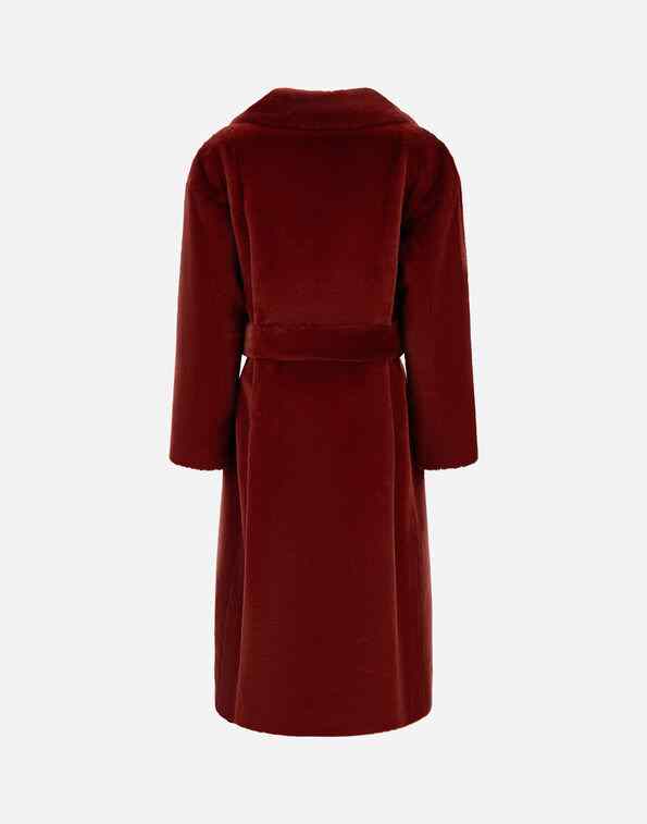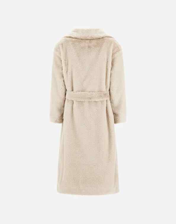 Faux fur tie coat with pockets and large lapel. This style offers a cosy design and sophisticated aesthetic that brings a touch of relaxed elegance to both special events and informal occasions. The lapel collar protects the wearer on very cold days, while the belt fastening allows you to adjust the style, wearing it either open or cinched at the waist.