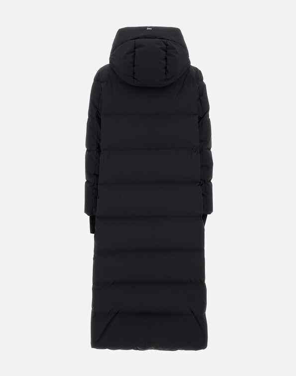 A long jacket in polyester microfibre bonded to a high-performance membrane that delivers breathability and a water-column resistance rating of 20,000 mm. Herno heritage and modern functionality combine in this cosy garment, designed as a luxurious upgrade for travel and outdoor-activity outfits. The coat is a regular fit with feather padding, removable hood, knit cuffs with thumbhole, zipped pockets amd double zip fastening.