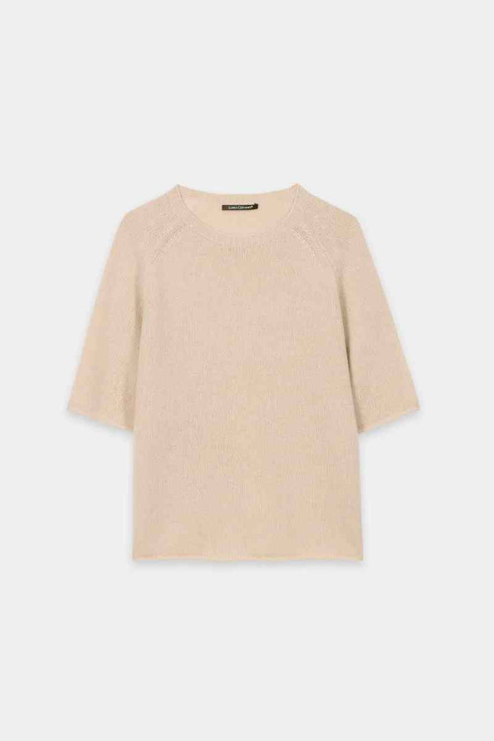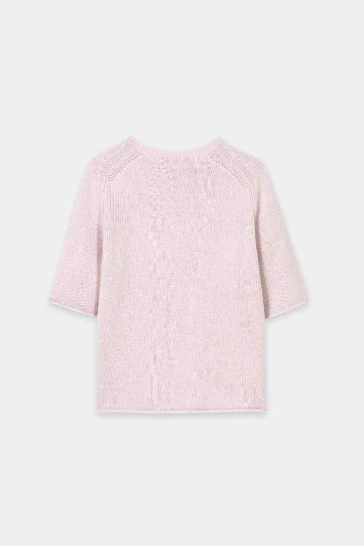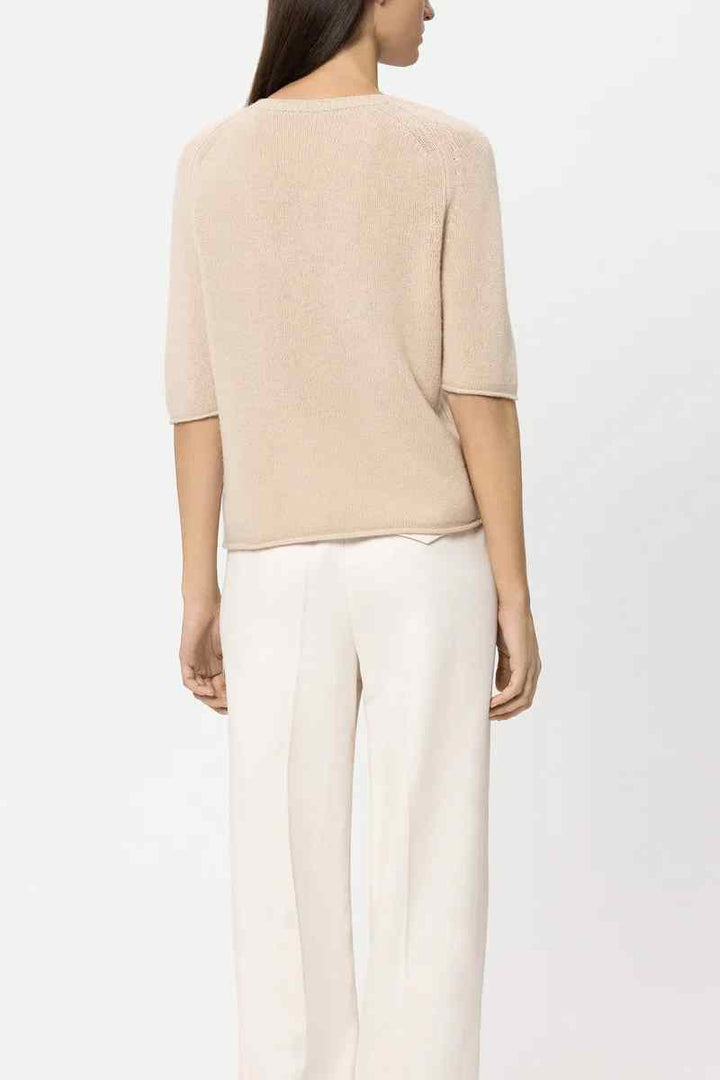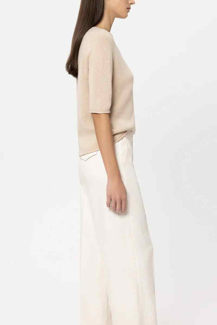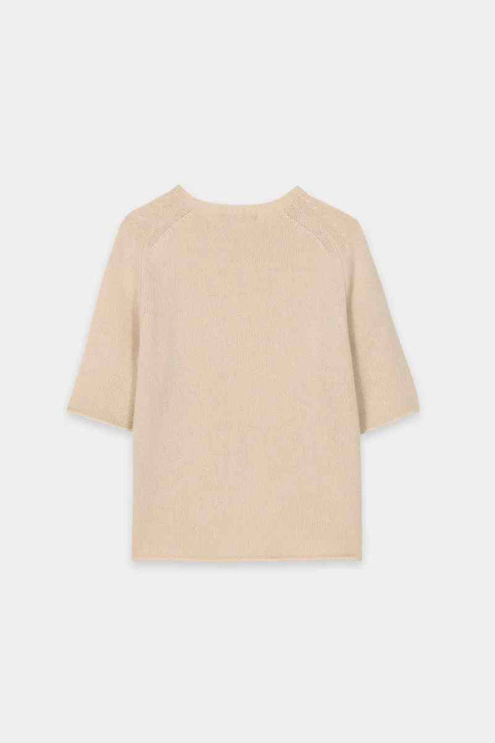 Boxy cut knitted sweater made from a particularly soft cashmere blend with a round neckline and short sleeves. Reduction details and the rolled hem at the ends complete the design.