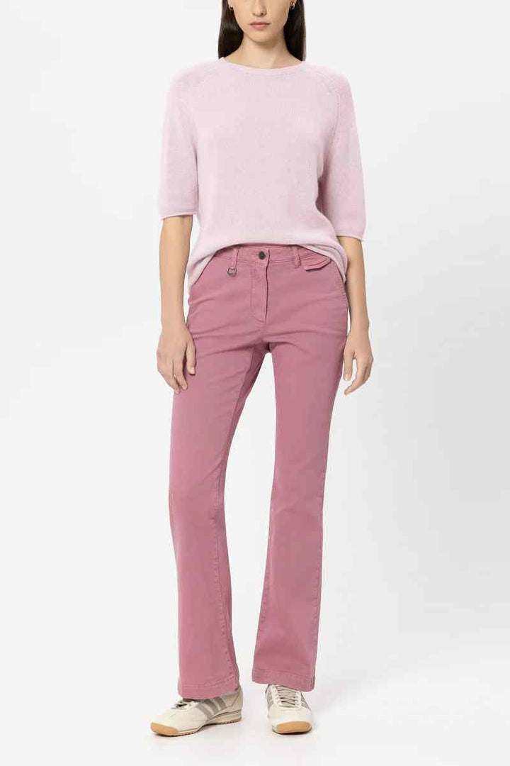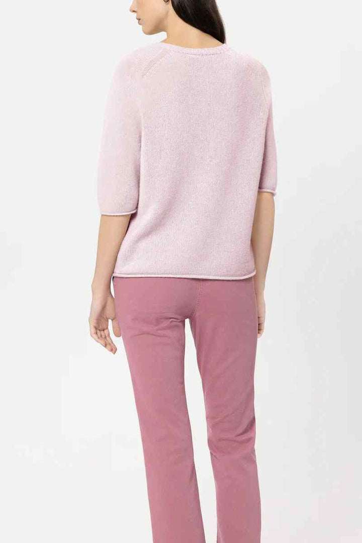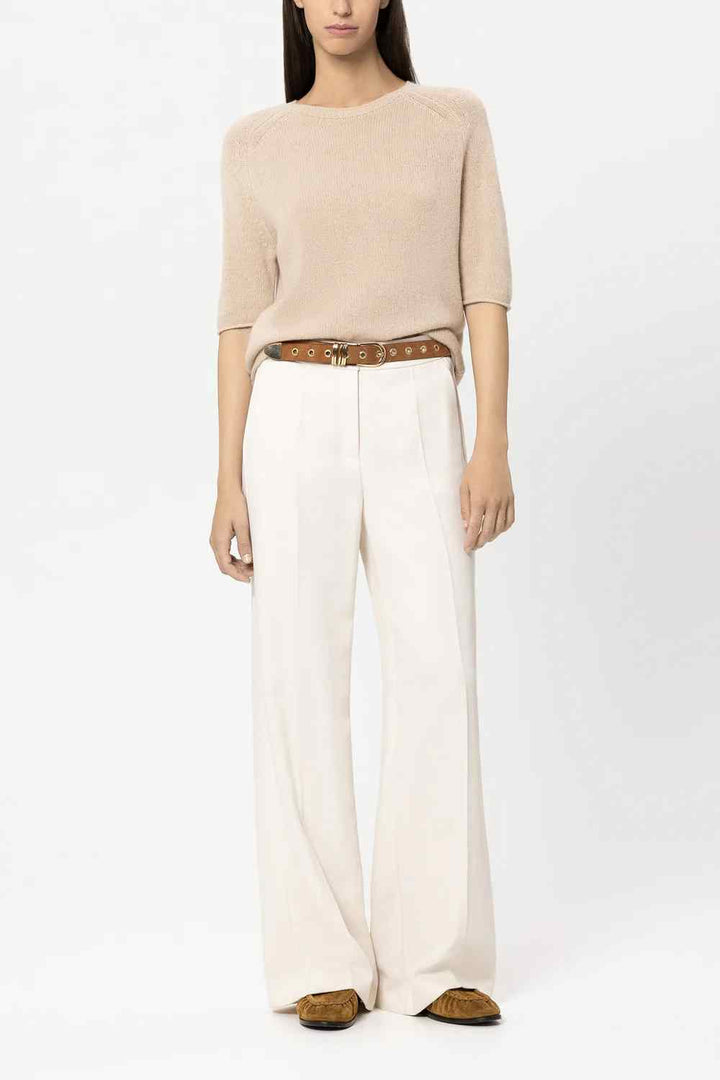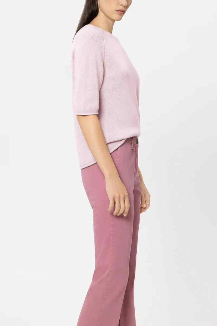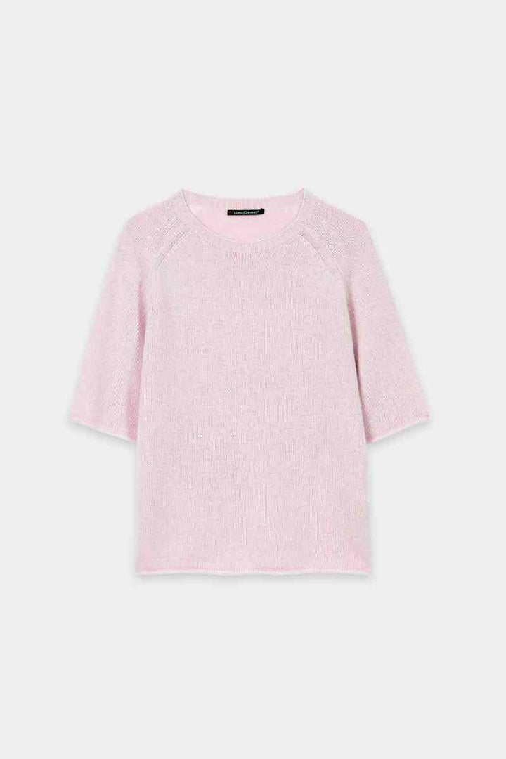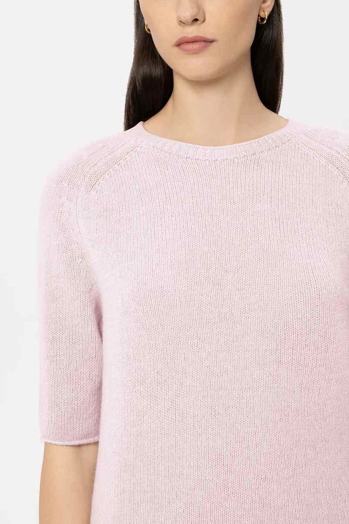 Boxy cut knitted sweater made from a particularly soft cashmere blend with a round neckline and short sleeves. Reduction details and the rolled hem at the ends complete the design.