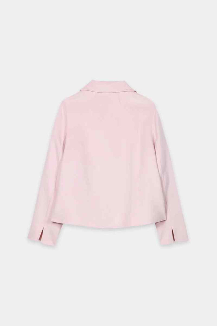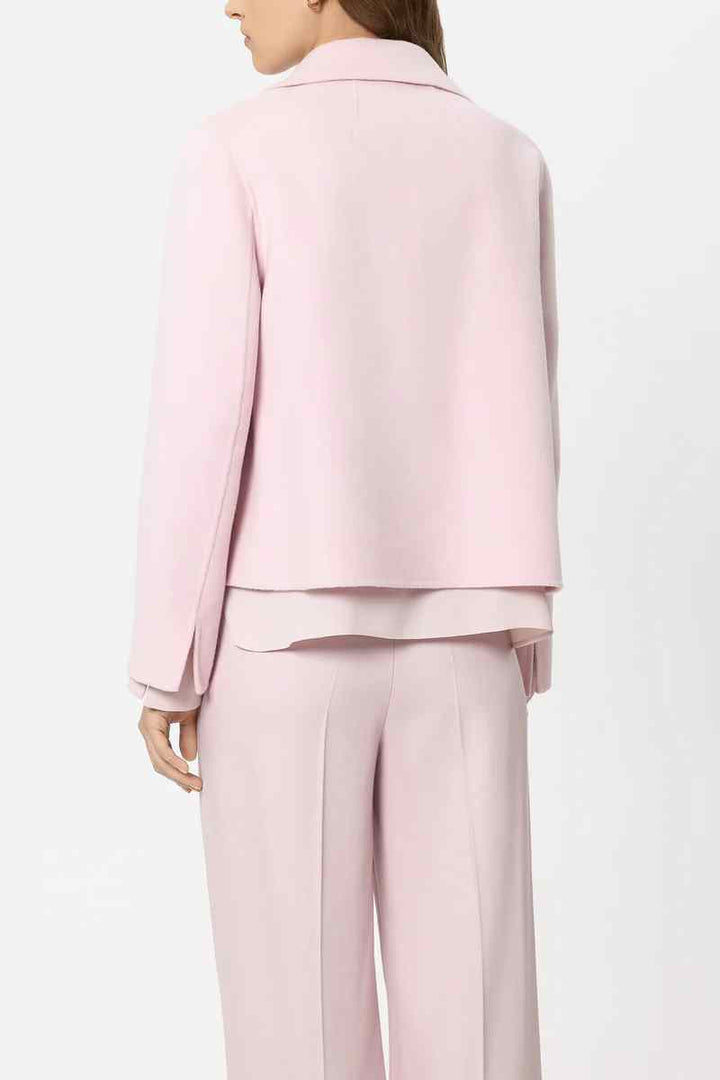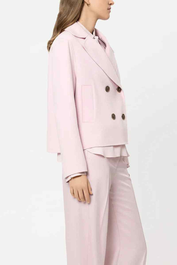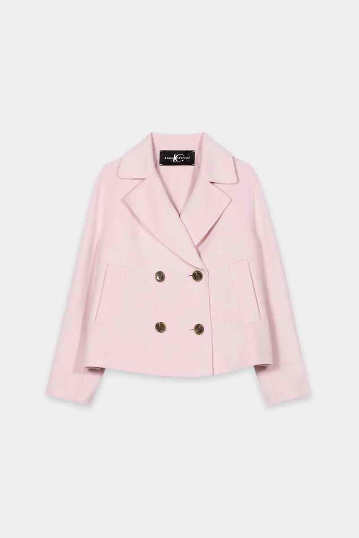 Cropped caban jacket made from a luxurious wool and cashmere blend with a sophisticated, handmade double-faced finish. The double-breasted buttoned jacket has a classic lapel collar and two side pockets.