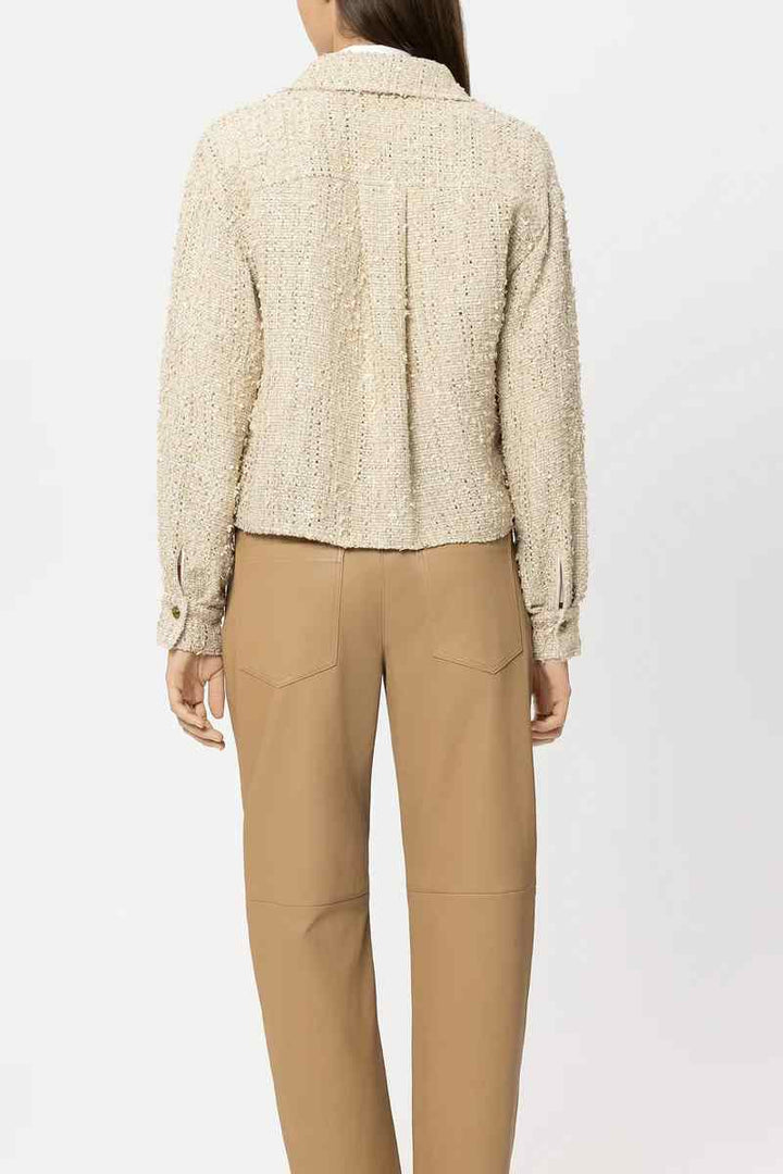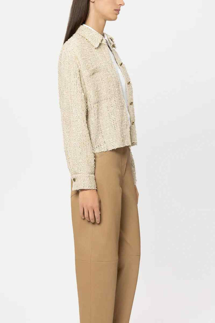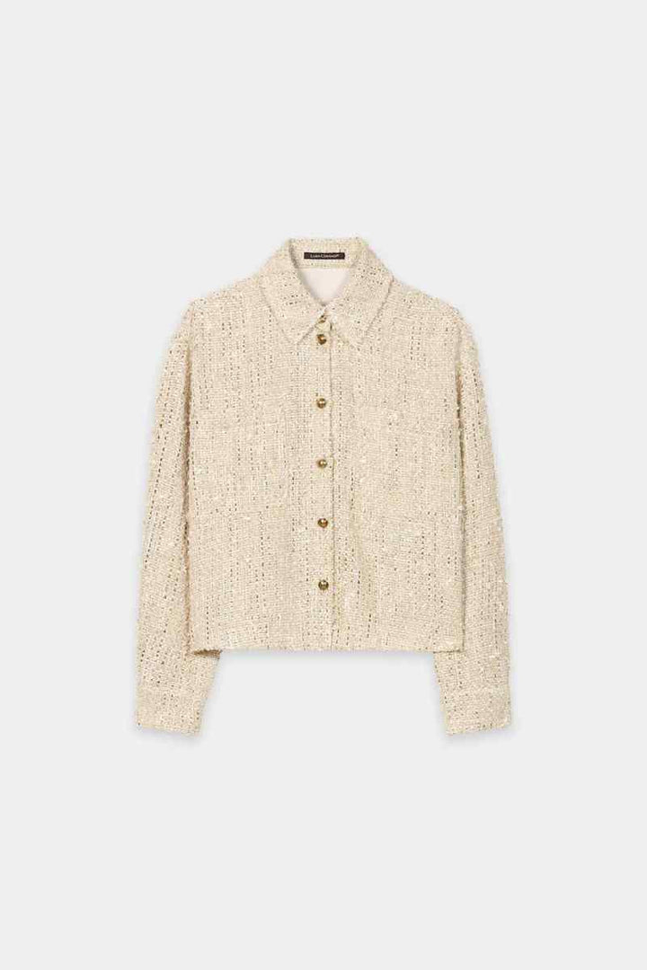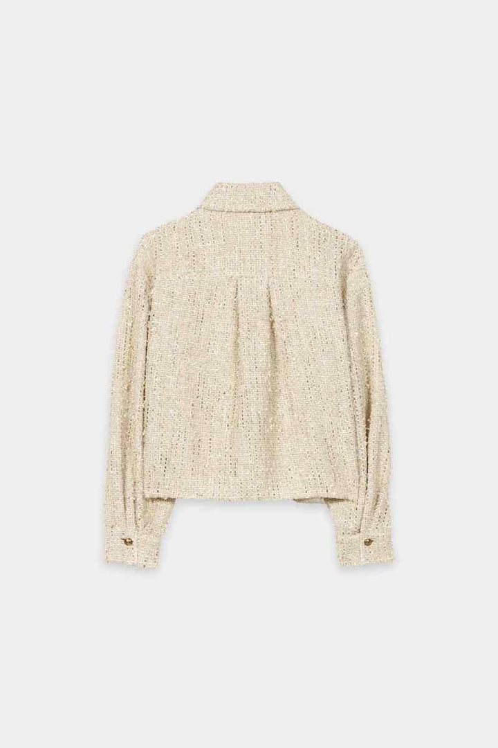 Short, unlined tweed jacket with a collar, button placket, two breast pockets and open hems. The incorporated shiny yarn creates a special effect.