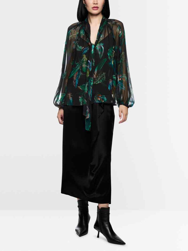 Airy, transparent viscose blouse with an elegant feather print, and with a loose fit for maximum comfort. The bow ribbon adds a feminine touch, while narrow elasticated cuffs ensure a perfect fit.