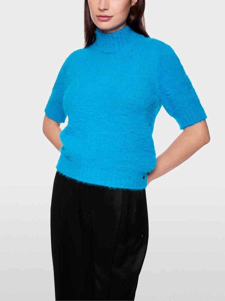 Short-sleeved jumper in soft stretch wool with a fluffy feel. The short length, elegant stand-up collar and fine ribbed details on the collar, sleeves and hem give the look a modern touch.