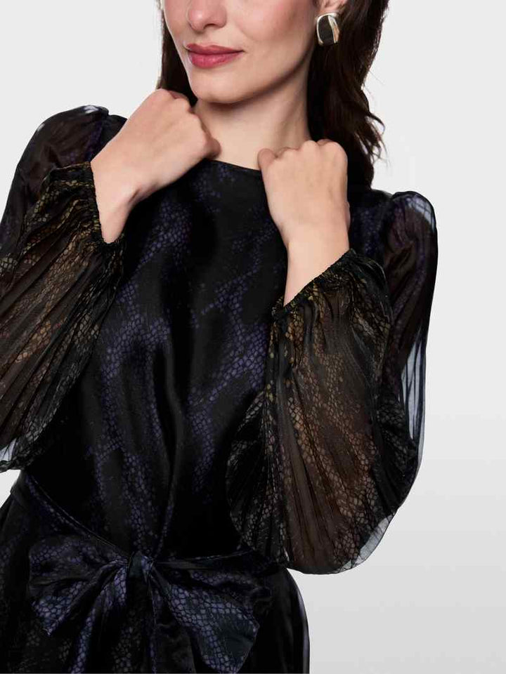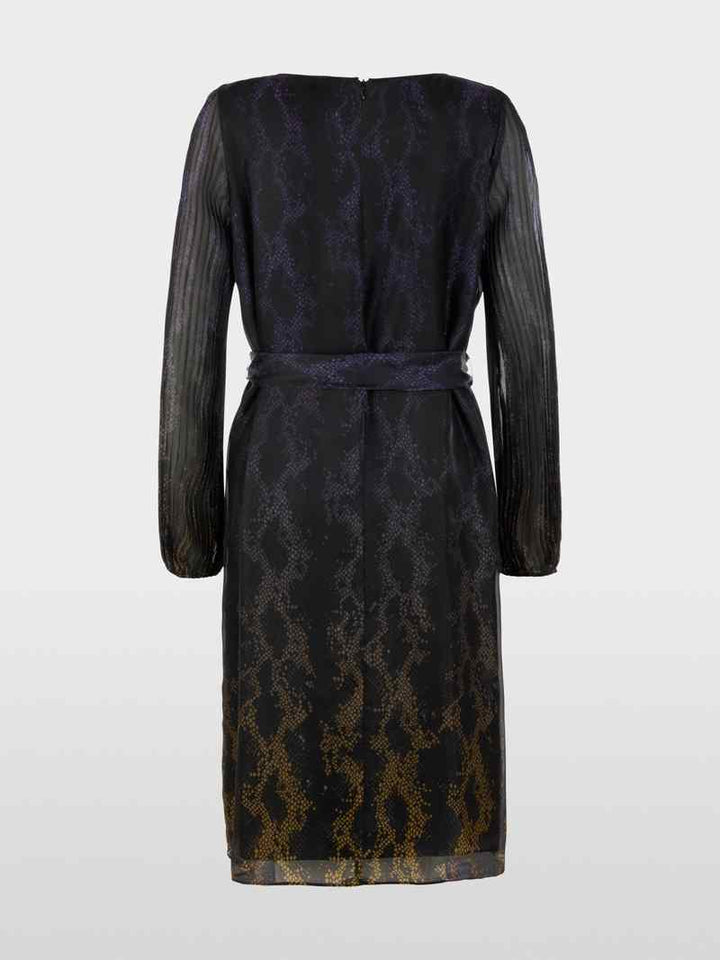 Loose-cut dress with trendy snake print and flared skirt. Transparent, pleated sleeves and a round neckline provide elegant details. Comfortable to wear due to the inner lining, with a zip at the back. The tie belt emphasises the waist and creates a feminine silhouette.
